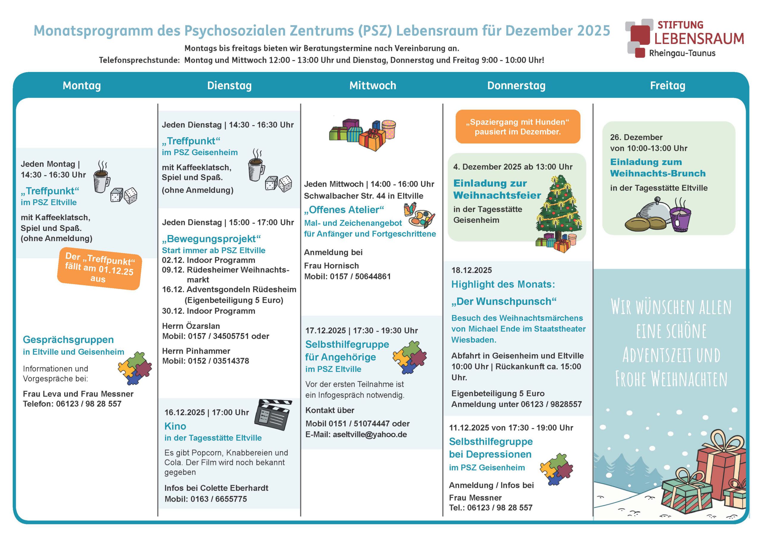 Im Dezember stehen Gemeinschaft und festliche Begegnungen im Mittelpunkt: Ob bei der Weihnachtsfeier, dem Kinoabend, dem Highlight-Ausflug zum Märchen „Der Wunschpunsch“ oder beim Weihnachts-Brunch – wir freuen uns auf schöne Momente mit Ihnen zum Jahresausklang. Wir wünschen allen eine stimmungsvolle Adventszeit und frohe Weihnachten!