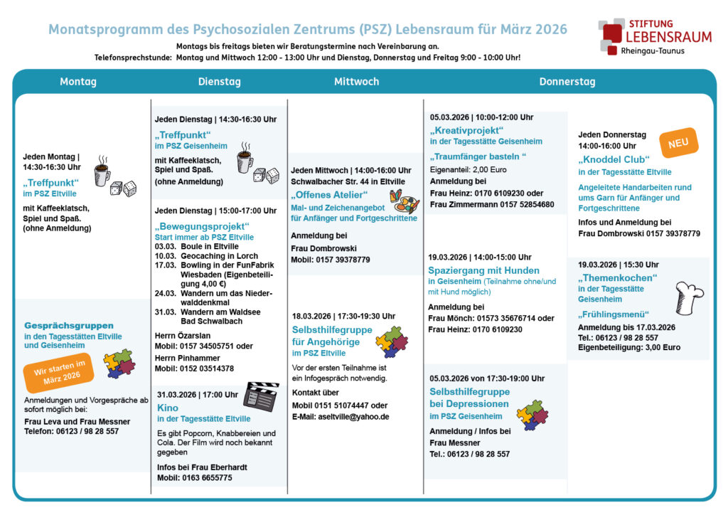 Mit frischer Frühlingsenergie starten wir in den März: Neben unseren bewährten Treffpunkten und Gruppenangeboten erwarten Sie kreative Projekte, gemeinsame Spaziergänge und ein abwechslungsreiches Bewegungsprogramm.